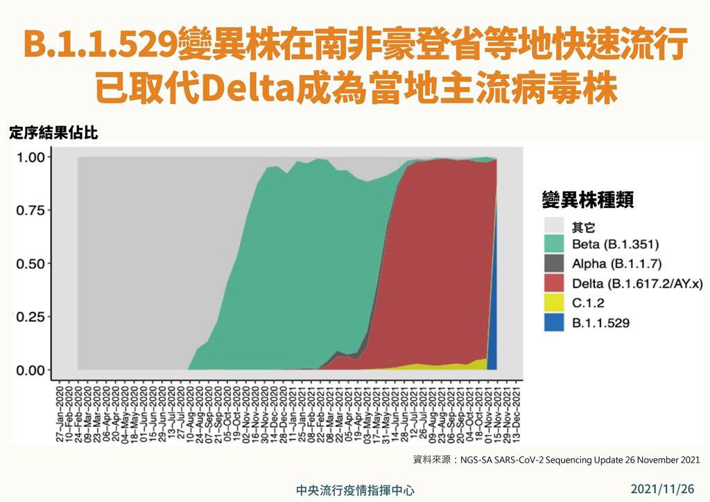 南非出現新 COVID-19 變異株:Omicron 變異株。因為突變的位點多和增加傳播力相關,所以目前推測傳播力比 Delta 變異株高,實際增加傳播率的數字尚未研究出來,但從南非豪登省等地病毒株分析報告發現,Omicron變異株快速取代 Delta 變異株成為當地主流病毒株,幾乎可以確定傳播力比 Delta 變異株大幅增加。